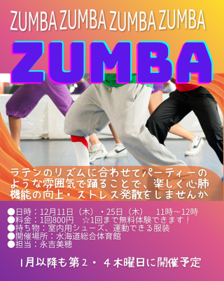12月から第1・3木曜日に「立腰体操」、第2・4木曜日に「ズンバ」を開催いたします。