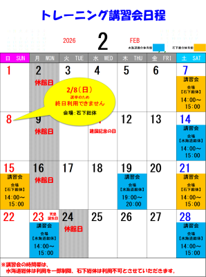 2月のトレーニング講習会の日程をお知らせいたします。